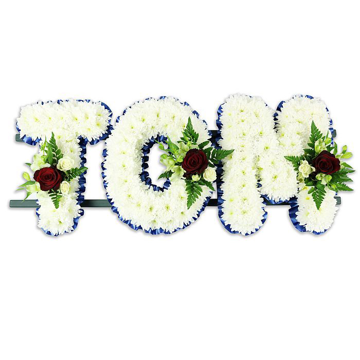 Honour a cherished life with the elegant Custom TOM Tribute from Elmers End Florist. This bespoke funeral letter tribute is lovingly hand-crafted with a bed of white chrysanthemums, accented with rich red roses and delicate white freesias for a timeless, respectful display. Designed to spell out TOM, it offers a dignified way to express your deepest sympathy and support at a funeral, memorial or celebration of life.