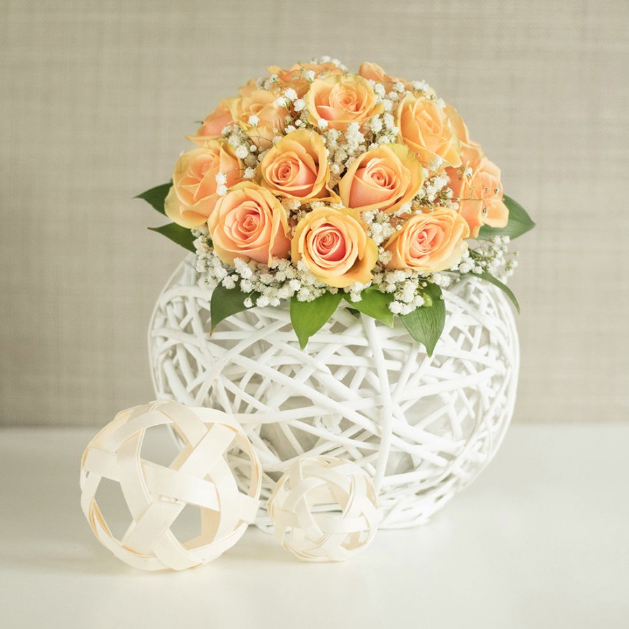 Illuminate your wedding with our vibrant bouquet of orange roses and gypsophila, designed to bring joy and elegance to your special day.